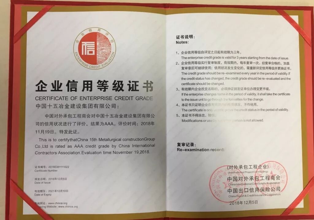 12月5日,從中國(guó)對(duì)外承包工程商會(huì)第七屆理事會(huì)第四次全體會(huì)議上獲悉,中國(guó)有色集團(tuán)出資企業(yè)中國(guó)十五冶金建設(shè)集團(tuán)有限公司(簡(jiǎn)稱:中國(guó)十五冶)被評(píng)為“2018年企業(yè)信用等級(jí)評(píng)價(jià)AAA級(jí)企業(yè)”。中國(guó)十五冶副總經(jīng)理王忠俊參加會(huì)議并代表公司領(lǐng)取獎(jiǎng)牌。