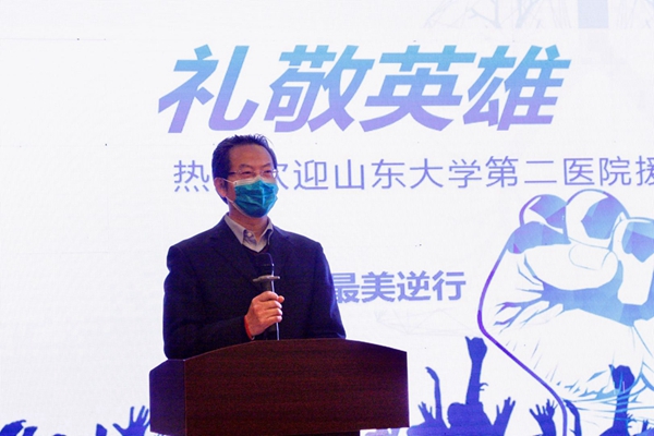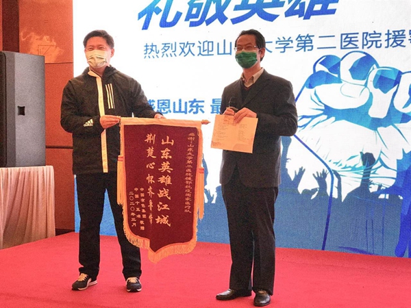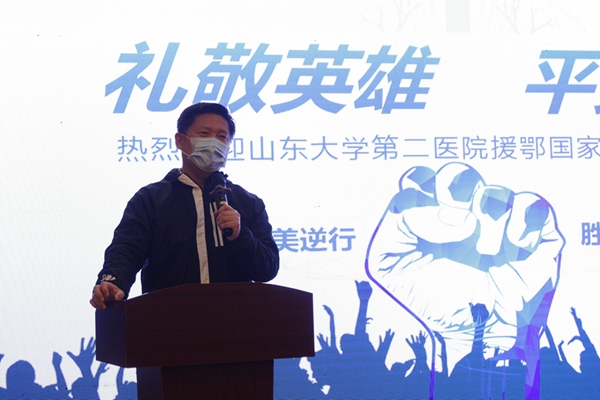 徐宗西飽含深情地說,慷慨自古英雄色,甘灑熱血寫青春。2月9日,在武漢疫情防控最艱難的時刻,你們響應黨和國家的號召,聞令而動、挺身而出,火線馳援、義無反顧,彰顯了“疫情就是命令、防控就是責任”的政治自覺,詮釋了扶危渡厄、救死扶傷的醫德醫風。從齊魯大地到黃鶴故里,風雪交加之夜,你們辭別家人、千里逆行,為患者和家屬點亮了生命之光;艱難困苦之際,你們白衣執甲、以命相拼,一腔熱血拯救了江城武漢;春暖花開之時,你們又收拾行裝、凱旋歸鄉,讓我們來不及看清彼此的模樣。但是,過往并肩鏖戰的五十多個日夜,大家用心和心結下的患難真情,這座英雄的城市將永世不忘!