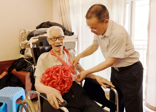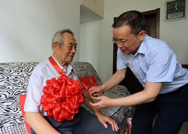圖 | 吳禮杰為離休老黨員佩戴“光榮在黨50年”紀念章