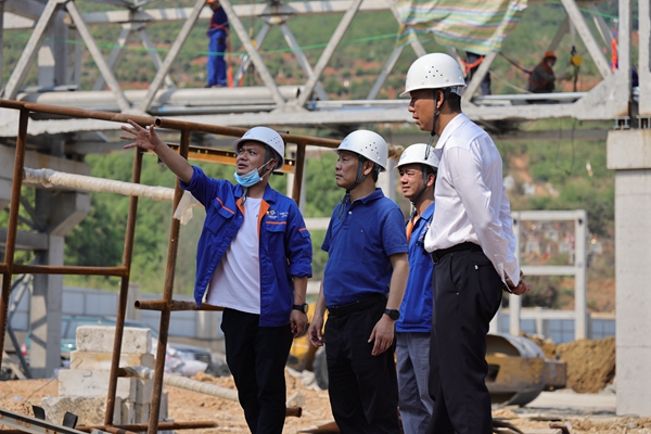 在安裝現場,喻振賢認真聽取了該廠負責人關于子項整體進度的簡要匯報。在了解到該廠正在進行裝酸、輸酸地下槽吊裝工作時,他強調:地下槽的吊裝難度較大,安裝隊伍一定要把安全放在首位,嚴格按照吊裝方案執行,把安全風險降到最低。同時,陽新弘盛項目已經進入攻堅沖刺階段,各專業班組必須在保證安全、質量的情況下加快進度。