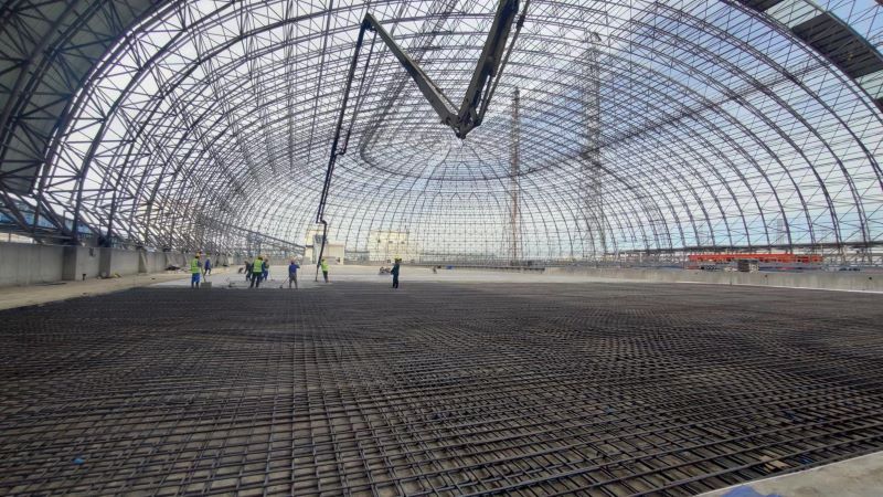 據悉,蘭炭棚煤場地坪由一個長146米,寬110米的長方形和兩個半徑55米的半圓組成,澆筑面積約為22700平方米。此部位將承載區域供熱中心煤塊能源的儲藏供應,屬于重載地面,工藝復雜,備受關注。該項目部主動出擊,化壓力為動力,克服重重困難。在打樁,土方換填結束后,大方量混凝土施工迫在眉睫,該項目部主動聯系設計院對設計進行優化,根據面積廣,澆筑方量大的情況,采取分段澆筑的方式。消防、網架、防火涂料同時作業,協調難度大,安全風險高,該項目部不等不靠,每天召開碰頭會,一一解決鋼筋、混凝土的供應問題,測量人員全程跟蹤計算,技術人員提前交底,緩解交叉施工帶來的不便。
