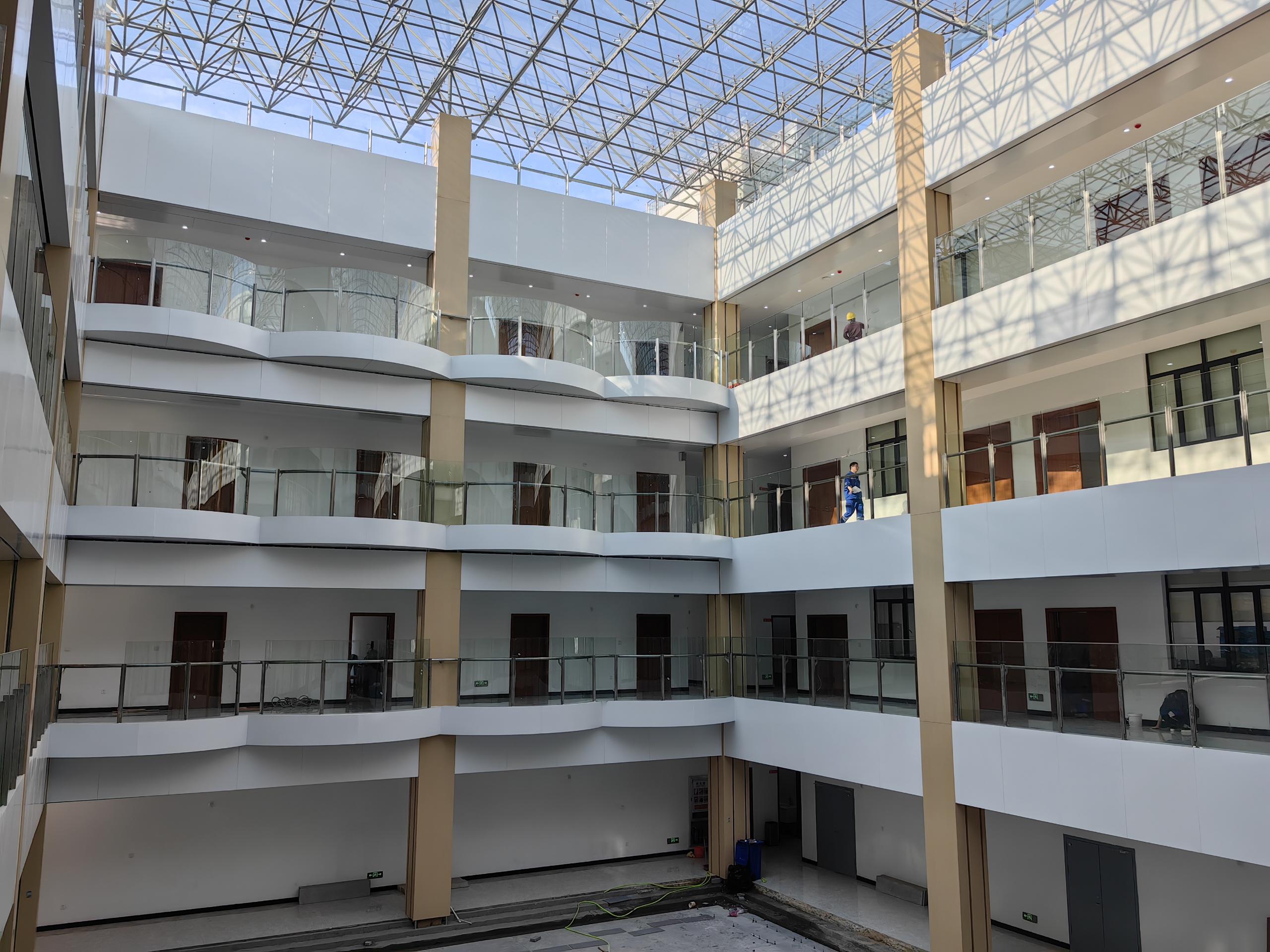 該項(xiàng)目辦公樓為四層結(jié)構(gòu),按照原圖紙的要求,該工程需要進(jìn)行二次深化設(shè)計(jì)。項(xiàng)目黨員干部主動(dòng)擔(dān)當(dāng)作為,發(fā)揮“領(lǐng)頭雁”效應(yīng),帶領(lǐng)工程技術(shù)人員研究圖紙、攻堅(jiān)克難,積極與業(yè)主溝通,有效的推進(jìn)了設(shè)計(jì)及施工方案選擇、材料報(bào)送確認(rèn)等工作進(jìn)程。此次施工難點(diǎn)集中在中庭部分,需要環(huán)四周重新搭設(shè)21米高的雙排腳手架作為操作平臺(tái),所有柱子、陽(yáng)臺(tái)鋁板要經(jīng)過(guò)精確的定位,才能保證嚴(yán)絲合縫,項(xiàng)目部每天下午召開(kāi)現(xiàn)場(chǎng)協(xié)調(diào)會(huì),測(cè)量、質(zhì)量、工程技術(shù)人員全過(guò)程參與到施工建設(shè)中,確保成型質(zhì)量,同時(shí)加強(qiáng)消防、弱電、電氣等專(zhuān)業(yè)施工人員的協(xié)調(diào),確保交叉施工安全有序。