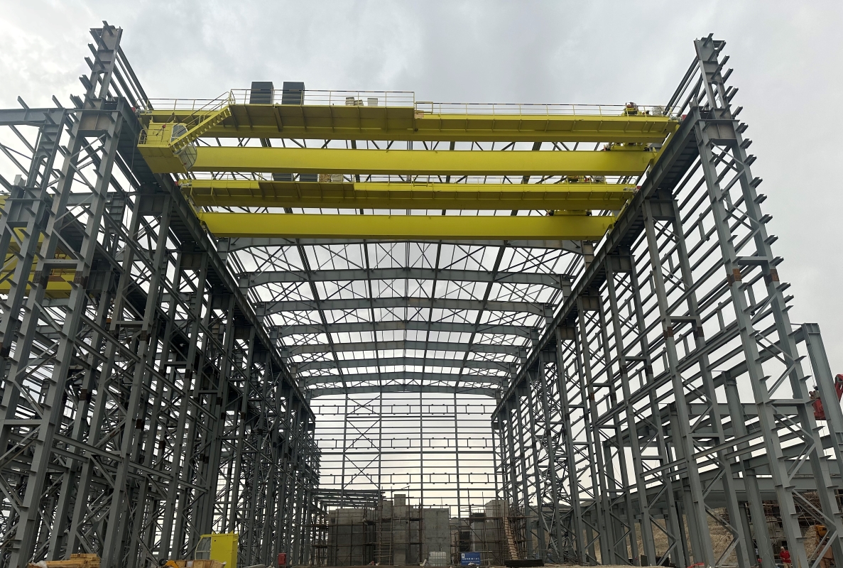 據悉,由于當地資源有限,該項目部積極組織相關人員討論制定安全可靠、切實可行的轉運及安裝方案。其中,輪距30.5米,單件15噸的行車主梁轉運采用了17米平板拖車并在車板前端增加配重壓車,車身手拉鏈條采用葫蘆多點捆綁,上坡前方裝載機牽引,后方挖機托抬方式進行轉運。單臺行車38.72噸,單件最重15噸,安裝高度26.2米,采用100噸汽車吊控制幅度結合手拉鏈條葫蘆調節端梁單件方式進行,此次行車轉運、安裝歷時4天。