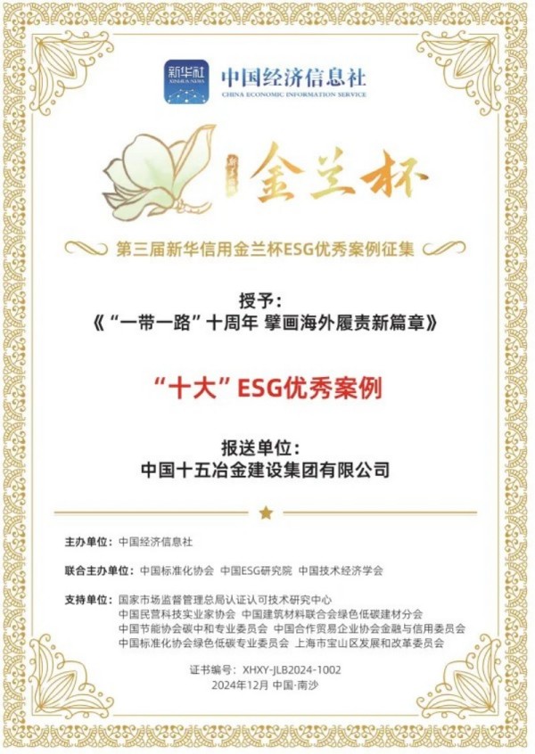 近日,由新華社中國經(jīng)濟(jì)信息社組織實(shí)施的第三屆“新華信用金蘭杯”ESG優(yōu)秀案例正式發(fā)布。因積極踐行綠色低碳理念,中國十五冶入選第三屆新華信用金蘭杯“十大”ESG優(yōu)秀案例。